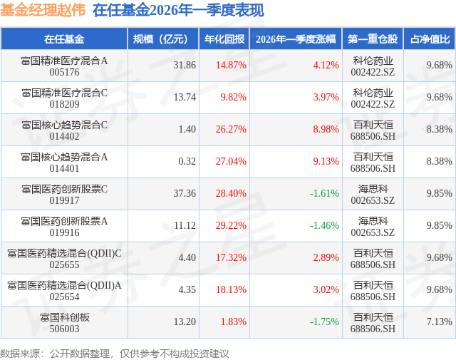 证券之星消息,日前富国精准医疗混合C基金公布一季报,2026年一季度最新规模13.74亿元,季度净值涨幅为3.97%。