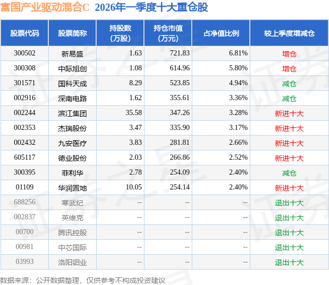 从基金规模来看,富国产业驱动混合C基金2026年一季度公布的基金规模为0.0亿元,较上一期规模9.89万元变化了12.91万元,环比变化了130.49%。该基金最新一期资产配置为:股票占净值比83.01%,无债券类资产,现金占净值比17.96%。从基金持仓来看,该基金当季前十大股票仓位达37.34%,第一大重仓股为新易盛(300502),持仓占比为6.81%。