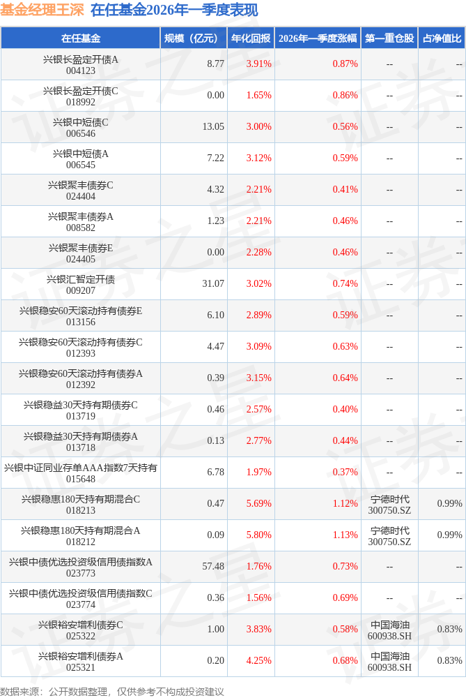 证券之星消息,日前兴银稳惠180天持有期混合A基金公布一季报,2026年一季度最新规模0.09亿元,季度净值涨幅为1.13%。