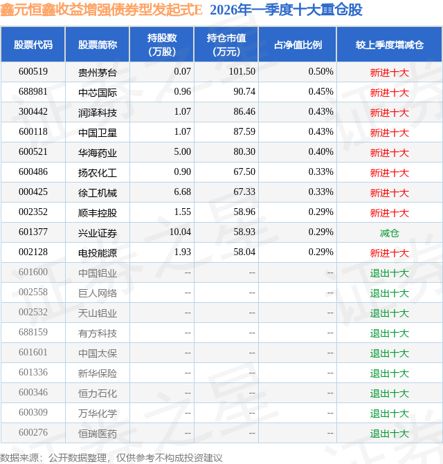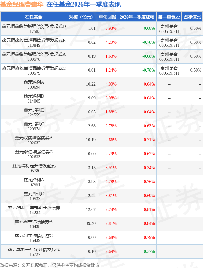 从基金规模来看,鑫元恒鑫收益增强债券型发起式E基金2026年一季度公布的基金规模为0.82亿元,较上一期规模0.01万元变化了8151.4万元,环比变化了111.53万倍。该基金最新一期资产配置为:股票占净值比9.11%,债券占净值比76.4%,现金占净值比2.73%。从基金持仓来看,该基金当季前十大股票仓位达3.74%,第一大重仓股为贵州茅台(600519),持仓占比为0.5%。
