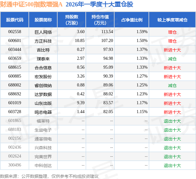 从基金规模来看,财通中证500指数增强A基金2026年一季度公布的基金规模为0.29亿元,较上一期规模7350.99万元变化了-4415.91万元,环比变化了-60.07%。该基金最新一期资产配置为:股票占净值比92.89%,无债券类资产,现金占净值比7.52%。从基金持仓来看,该基金当季前十大股票仓位达13.19%,第一大重仓股为巨人网络(002558),持仓占比为1.59%。