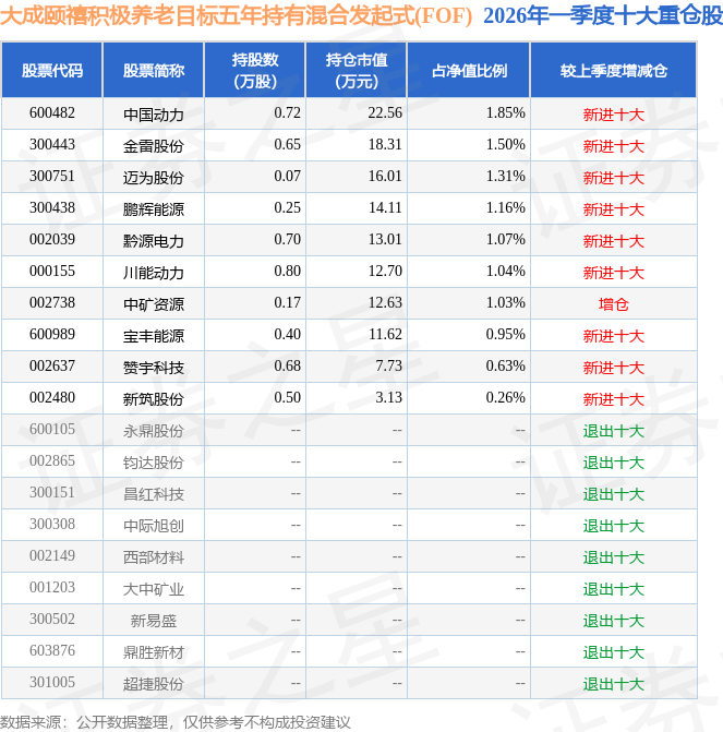 从基金规模来看,大成颐禧积极养老目标五年持有混合发起式(FOF)基金2026年一季度公布的基金规模为0.12亿元,较上一期规模1005.5万元变化了215.88万元,环比变化了21.47%。该基金最新一期资产配置为:股票占净值比10.79%,债券占净值比4.94%,现金占净值比1.23%。从基金持仓来看,该基金当季前十大股票仓位达10.8%,第一大重仓股为中国动力(600482),持仓占比为1.85%。
