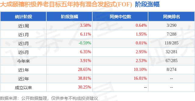 从业绩表现来看,大成颐禧积极养老目标五年持有混合发起式(FOF)基金过去一年净值涨幅为28.65%,在同类基金中排名8/274,同类基金过去一年净值涨幅中位数为10.1%。而基金过去一年的最大回撤为-11.26%,成立以来的最大回撤为-12.88%。