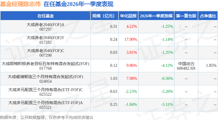 证券之星消息,日前大成颐禧积极养老目标五年持有混合发起式(FOF)基金公布一季报,2026年一季度最新规模0.12亿元,季度净值涨幅为-4.12%。