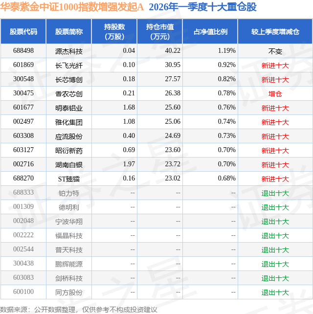 从基金规模来看,华泰紫金中证1000指数增强发起A基金2026年一季度公布的基金规模为0.17亿元,较上一期规模1019.71万元变化了679.24万元,环比变化了66.61%。该基金最新一期资产配置为:股票占净值比92.06%,债券占净值比0.3%,现金占净值比6.47%。从基金持仓来看,该基金当季前十大股票仓位达8.02%,第一大重仓股为源杰科技(688498),持仓占比为1.19%。
