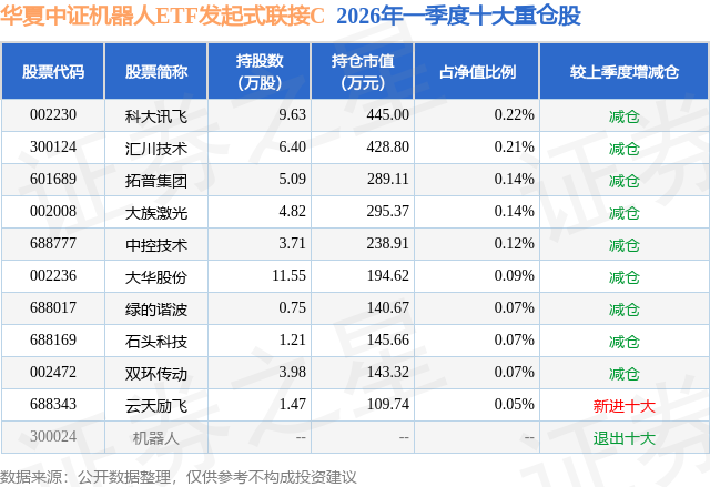从基金规模来看,华夏中证机器人ETF发起式联接C基金2026年一季度公布的基金规模为13.85亿元,较上一期规模2.69亿元变化了11.16亿元,环比变化了414.11%。该基金最新一期资产配置为:股票占净值比2.17%,债券占净值比0.78%,现金占净值比5.67%。从基金持仓来看,该基金当季前十大股票仓位达1.18%,第一大重仓股为科大讯飞(002230),持仓占比为0.22%。