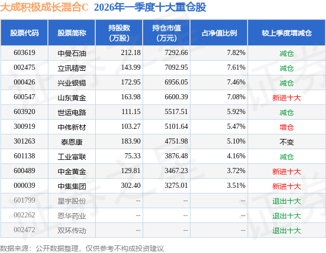 从基金规模来看,大成积极成长混合C基金2026年一季度公布的基金规模为0.02亿元,较上一期规模18.06万元变化了204.87万元,环比变化了1134.61%。该基金最新一期资产配置为:股票占净值比87.93%,无债券类资产,现金占净值比11.75%。从基金持仓来看,该基金当季前十大股票仓位达57.85%,第一大重仓股为中曼石油(603619),持仓占比为7.82%。