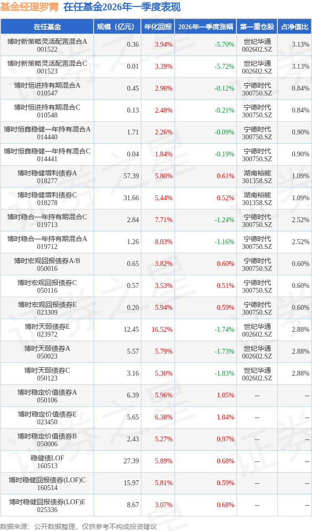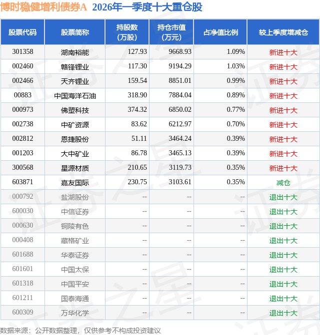 从基金规模来看,博时稳健增利债券A基金2026年一季度公布的基金规模为57.39亿元,较上一期规模6426.85万元变化了56.75亿元,环比变化了8830.34%。该基金最新一期资产配置为:股票占净值比9.97%,债券占净值比112.52%,现金占净值比14.06%。从基金持仓来看,该基金当季前十大股票仓位达6.95%,第一大重仓股为湖南裕能(301358),持仓占比为1.09%。