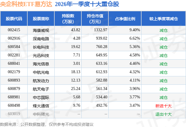 从基金规模来看,央企科技ETF易方达基金2026年一季度公布的基金规模为1.42亿元,较上一期规模1.57亿元变化了-1541.41万元,环比变化了-9.8%。该基金最新一期资产配置为:股票占净值比98.97%,无债券类资产,现金占净值比1.0%。从基金持仓来看,该基金当季前十大股票仓位达50.05%,第一大重仓股为海康威视(002415),持仓占比为9.4%。