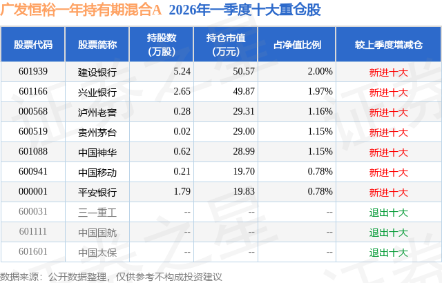 从基金规模来看,广发恒裕一年持有期混合A基金2026年一季度公布的基金规模为0.22亿元,较上一期规模2626.86万元变化了-379.76万元,环比变化了-14.46%。该基金最新一期资产配置为:股票占净值比8.99%,债券占净值比59.2%,现金占净值比32.45%。从基金持仓来看,该基金当季前十大股票仓位达8.99%,第一大重仓股为建设银行(601939),持仓占比为2.0%。