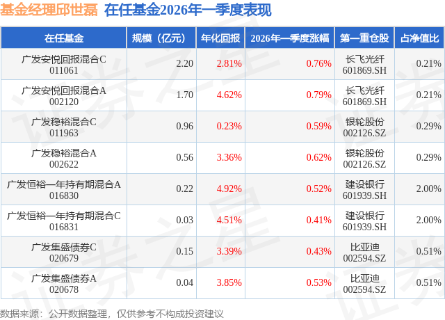 证券之星消息,日前广发恒裕一年持有期混合C基金公布一季报,2026年一季度最新规模0.03亿元,季度净值涨幅为0.41%。