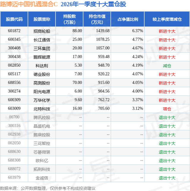 从基金规模来看,路博迈中国机遇混合C基金2026年一季度公布的基金规模为1.02亿元,较上一期规模7392.8万元变化了2795.22万元,环比变化了37.81%。该基金最新一期资产配置为:股票占净值比89.38%,债券占净值比4.02%,现金占净值比3.99%。从基金持仓来看,该基金当季前十大股票仓位达42.85%,第一大重仓股为招商轮船(601872),持仓占比为6.37%。