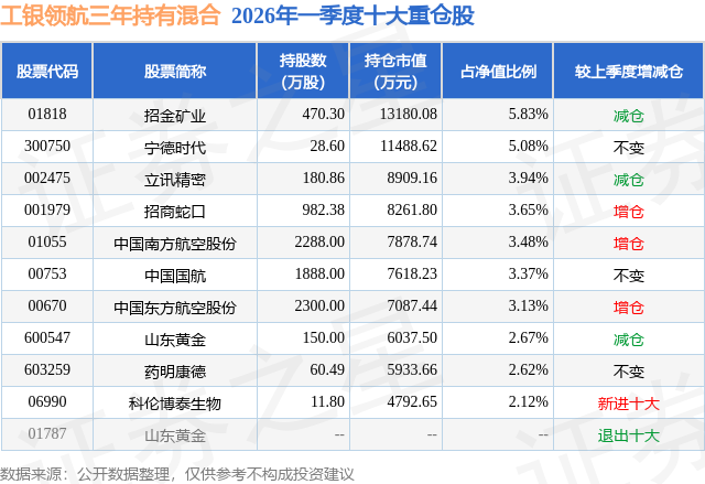 从基金规模来看,工银领航三年持有混合基金2026年一季度公布的基金规模为22.62亿元,较上一期规模17.64亿元变化了4.98亿元,环比变化了28.21%。该基金最新一期资产配置为:股票占净值比83.78%,债券占净值比0.01%,现金占净值比15.09%。从基金持仓来看,该基金当季前十大股票仓位达35.89%,第一大重仓股为招金矿业(01818),持仓占比为5.83%。
