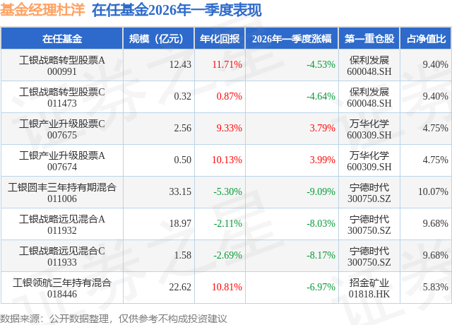 证券之星消息,日前工银领航三年持有混合基金公布一季报,2026年一季度最新规模22.62亿元,季度净值涨幅为-6.97%。