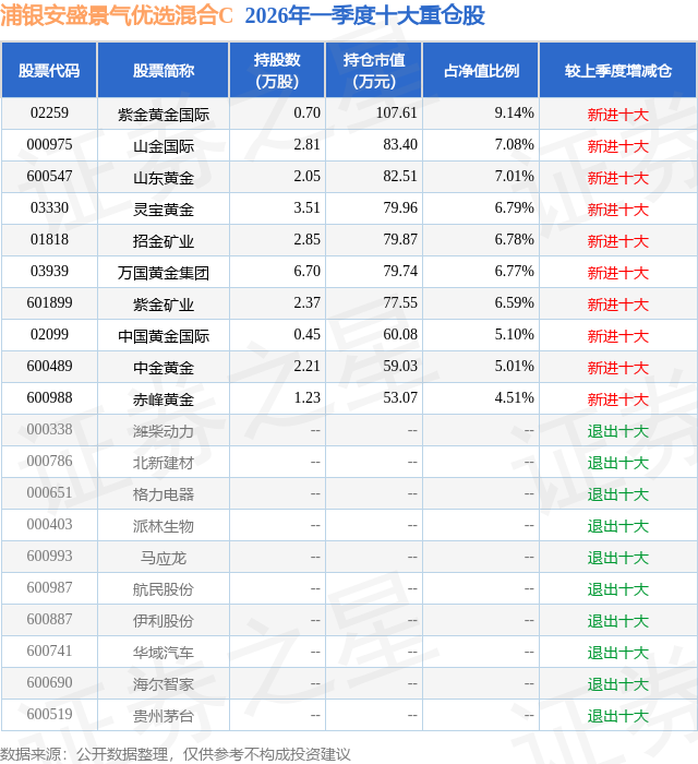 从基金规模来看,浦银安盛景气优选混合C基金2026年一季度公布的基金规模为0.1亿元,较上一期规模519.41万元变化了440.79万元,环比变化了84.86%。该基金最新一期资产配置为:股票占净值比79.62%,债券占净值比1.72%,现金占净值比19.82%。从基金持仓来看,该基金当季前十大股票仓位达64.78%,第一大重仓股为紫金黄金国际(02259),持仓占比为9.14%。