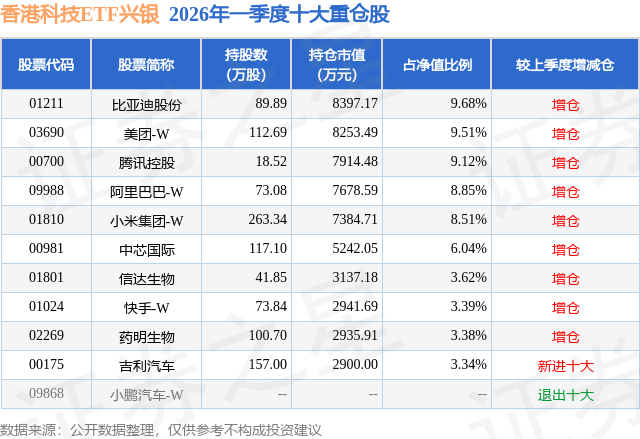 从基金规模来看,香港科技ETF兴银基金2026年一季度公布的基金规模为8.68亿元,较上一期规模9.18亿元变化了-4999.76万元,环比变化了-5.45%。该基金最新一期资产配置为:股票占净值比97.87%,无债券类资产,现金占净值比2.38%。从基金持仓来看,该基金当季前十大股票仓位达65.44%,第一大重仓股为比亚迪股份(01211),持仓占比为9.68%。