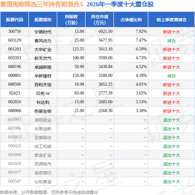 从基金规模来看,富国周期精选三年持有期混合A基金2026年一季度公布的基金规模为6.44亿元,较上一期规模11.42亿元变化了-4.98亿元,环比变化了-43.59%。该基金最新一期资产配置为:股票占净值比93.86%,无债券类资产,现金占净值比6.86%。从基金持仓来看,该基金当季前十大股票仓位达49.98%,第一大重仓股为宁德时代(300750),持仓占比为7.92%。