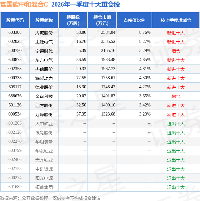 从基金规模来看,富国碳中和混合C基金2026年一季度公布的基金规模为2.33亿元,较上一期规模5906.32万元变化了1.74亿元,环比变化了295.12%。该基金最新一期资产配置为:股票占净值比90.07%,无债券类资产,现金占净值比12.32%。从基金持仓来看,该基金当季前十大股票仓位达50.85%,第一大重仓股为应流股份(603308),持仓占比为8.76%。