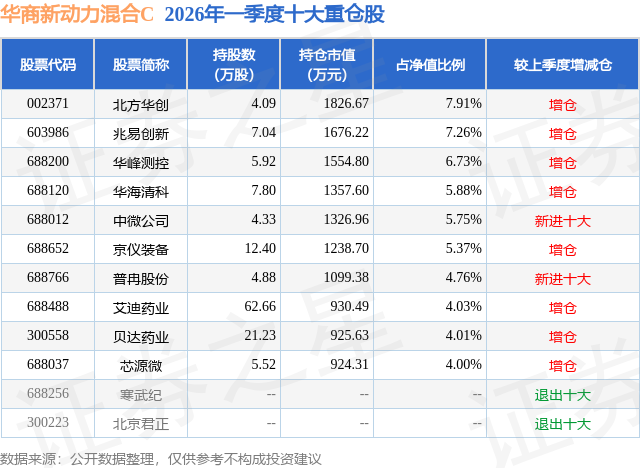 从基金规模来看,华商新动力混合C基金2026年一季度公布的基金规模为1.48亿元,较上一期规模384.41万元变化了1.44亿元,环比变化了3749.86%。该基金最新一期资产配置为:股票占净值比91.91%,无债券类资产,现金占净值比6.92%。从基金持仓来看,该基金当季前十大股票仓位达55.7%,第一大重仓股为北方华创(002371),持仓占比为7.91%。