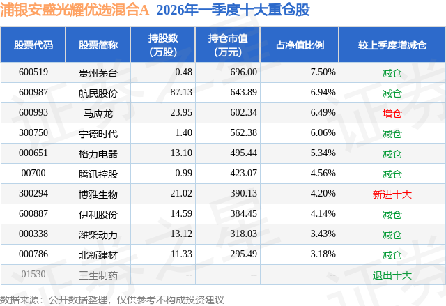 从基金规模来看,浦银安盛光耀优选混合A基金2026年一季度公布的基金规模为0.25亿元,较上一期规模6647.2万元变化了-4190.53万元,环比变化了-63.04%。该基金最新一期资产配置为:股票占净值比92.16%,债券占净值比5.55%,现金占净值比1.57%。从基金持仓来看,该基金当季前十大股票仓位达51.84%,第一大重仓股为贵州茅台(600519),持仓占比为7.5%。