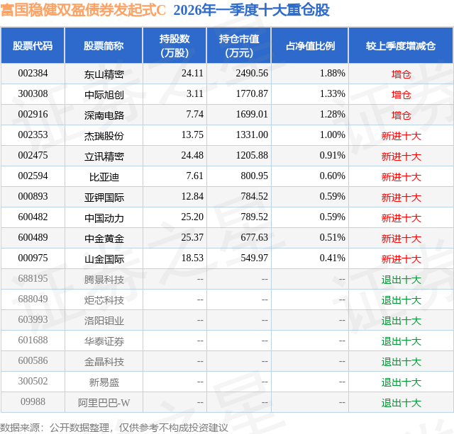 从基金规模来看,富国稳健双盈债券发起式C基金2026年一季度公布的基金规模为4.56亿元,较上一期规模6184.48万元变化了3.95亿元,环比变化了637.93%。该基金最新一期资产配置为:股票占净值比12.0%,债券占净值比82.39%,现金占净值比6.74%。从基金持仓来看,该基金当季前十大股票仓位达9.1%,第一大重仓股为东山精密(002384),持仓占比为1.88%。