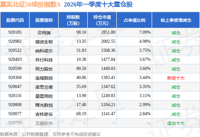 从基金规模来看,嘉实北证50成份指数A基金2026年一季度公布的基金规模为0.88亿元,较上一期规模8602.99万元变化了225.77万元,环比变化了2.62%。该基金最新一期资产配置为:股票占净值比94.66%,债券占净值比1.25%,现金占净值比4.42%。从基金持仓来看,该基金当季前十大股票仓位达38.82%,第一大重仓股为贝特瑞(920185),持仓占比为7.09%。