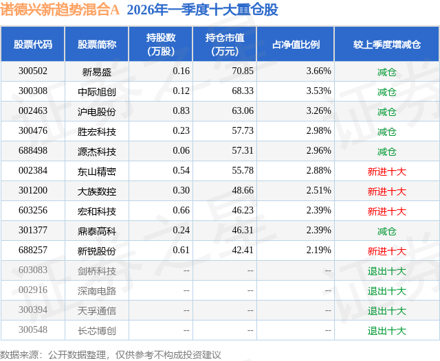 从基金规模来看,诺德兴新趋势混合A基金2026年一季度公布的基金规模为0.07亿元,较上一期规模1930.45万元变化了-1181.2万元,环比变化了-61.19%。该基金最新一期资产配置为:股票占净值比66.5%,无债券类资产,现金占净值比33.48%。从基金持仓来看,该基金当季前十大股票仓位达28.75%,第一大重仓股为新易盛(300502),持仓占比为3.66%。