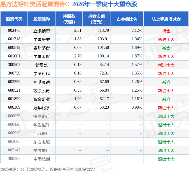 证券之星消息,日前易方达裕如灵活配置混合C基金公布一季报,2026年一季度最新规模0.16亿元,季度净值涨幅为-0.05%。