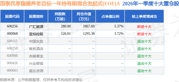 从基金规模来看,国泰民享稳健养老目标一年持有期混合发起式(FOF)A基金2026年一季度公布的基金规模为3.48亿元,较上一期规模1667.38万元变化了3.31亿元,环比变化了1987.0%。该基金最新一期资产配置为:股票占净值比9.09%,债券占净值比5.3%,现金占净值比0.87%。从基金持仓来看,该基金当季前十大股票仓位达9.09%,第一大重仓股为广汇能源(600256),持仓占比为5.37%。