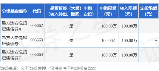 注:(1)根据法律法规和基金合同的相关规定,易方达基金管理有限公司决定自2026年4月29日起,易方达安悦超短债债券型证券投资基金(以下简称“本基金”)A类基金份额、C类基金份额和F类基金份额在非直销销售机构暂停大额申购及大额转换转入业务,单日单个基金账户在全部非直销销售机构累计申购(含定期定额投资及转换转入,下同)本基金A类基金份额或C类基金份额或F类基金份额的金额不超过100万元(含)。如单日单个基金账户单笔申购本基金A类基金份额或C类基金份额或F类基金份额的金额超过100万元(不含),则100万元确认申购成功,超过100万元(不含)金额的部分将确认失败;如单日单个基金账户多笔累计申购本基金A类基金份额的金额超过100万元(不含)或单日单个基金账户多笔累计申购本基金C类基金份额的金额超过100万元(不含)或单日单个基金账户多笔累计申购本基金F类基金份额的金额超过100万元(不含),则对该类基金份额的申请按照申请金额从大到小排序,基金管理人将逐笔累加至该类基金份额不超过100万元(含)限额的申请确认成功,该类基金份额其余申请金额确认失败。