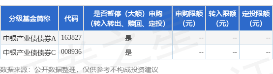 证券之星消息,4月24日中银基金管理有限公司发布《关于中银产业债债券型证券投资基金暂停申购、转换转入及定期定额投资业务的公告》。公告中提示,为保护基金份额持有人利益,自2026年4月24日起中银产业债债券型证券投资基金暂停申购、转换转入及定期定额投资业务,下属分级基金调整明细如下: