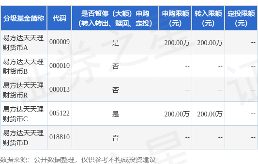 注:(1)根据法律法规和基金合同的相关规定,易方达基金管理有限公司决定自2026年4月29日起,易方达天天理财货币市场基金(以下简称“本基金”)A类基金份额、C类基金份额在全部非直销销售机构调整大额申购及大额转换转入业务限制,具体调整为:单日单个基金账户在全部非直销销售机构(C类基金份额由腾安基金销售的除外)累计申购(A类份额含定期定额投资及转换转入,下同)本基金A类基金份额或C类基金份额的金额不超过200万元(含)。如单日单个基金账户单笔申购本基金A类基金份额或C类基金份额的金额超过200万元(不含),则200万元确认申购成功,超过200万元(不含)金额的部分将确认失败;如单日单个基金账户多笔累计申购本基金A类基金份额的金额超过200万元(不含)或单日单个基金账户多笔累计申购本基金C类基金份额的金额超过200万元(不含),则对该类基金份额的申请按照申请金额从大到小排序,基金管理人将逐笔累加至该类基金份额不超过200万元(含)限额的申请确认成功,该类基金份额其余申请金额确认失败。