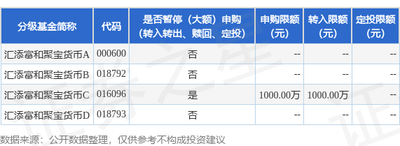 注:1、自2026年04月29日起(含2026年04月29日),汇添富和聚宝货币C调整代销渠道大额申购、大额转换转入、大额定期定额投资业务限制金额,单日单个基金账户单笔或多笔累计申购、转换转入、定期定额投资的金额不应超过10000000人民币元(含10000000人民币元)。当单日某基金账户单笔或多笔累计申购、转换转入、定期定额投资该份额的金额超过10000000人民币元,本公司将部分或全部拒绝。该份额暂停上述大额业务期间,其他业务仍照常办理。自2026年04月30日起,本基金汇添富和聚宝货币C代销渠道大额申购、大额转换转入、大额定期定额投资业务限制金额恢复至2亿人民币元,届时将不再另行公告。