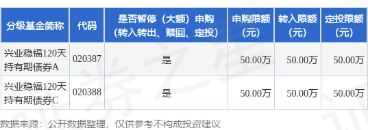 证券之星消息,4月24日兴业基金管理有限公司发布《兴业稳福120天持有期债券型证券投资基金2026年劳动节前暂停大额申购(含转换转入和定期定额投资)公告》。公告中提示,为了保证基金的平稳运作,保护现有基金份额持有人利益,自2026年4月29日起兴业稳福120天持有期债券型证券投资基金2026年劳动节前暂停大额申购(含转换转入和定期定额投资),申购、转换转入、定投上限金额为50.0万元,下属分级基金调整明细如下: