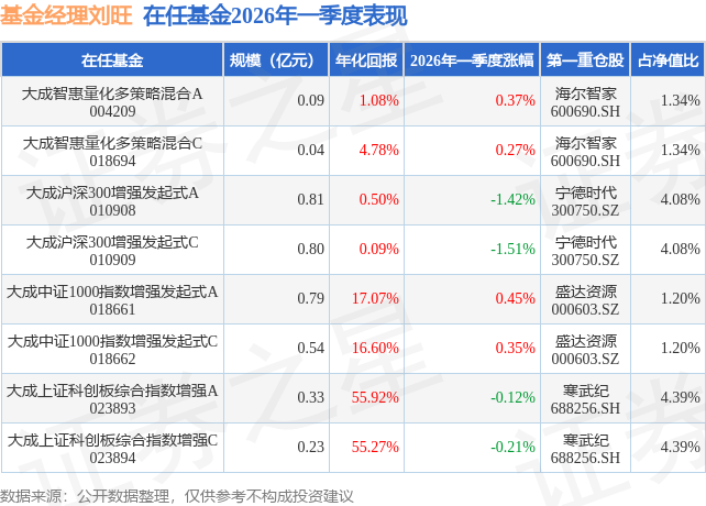 证券之星消息,日前大成智惠量化多策略混合C基金公布一季报,2026年一季度最新规模0.04亿元,季度净值涨幅为0.27%。