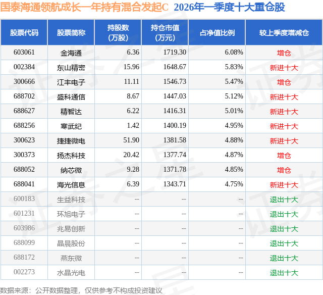 证券之星消息,日前国泰海通领航成长一年持有混合发起C基金公布一季报,2026年一季度最新规模0.51亿元,季度净值涨幅为8.3%。