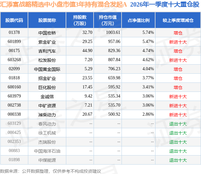 从基金规模来看,汇添富战略精选中小盘市值3年持有混合发起A基金2026年一季度公布的基金规模为1.5亿元,较上一期规模7839.78万元变化了7161.58万元,环比变化了91.35%。该基金最新一期资产配置为:股票占净值比70.81%,无债券类资产,现金占净值比27.97%。从基金持仓来看,该基金当季前十大股票仓位达40.77%,第一大重仓股为中国宏桥(01378),持仓占比为5.74%。