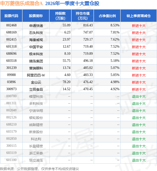 证券之星消息,日前申万菱信乐成混合A基金公布一季报,2026年一季度最新规模0.77亿元,季度净值涨幅为-16.56%。