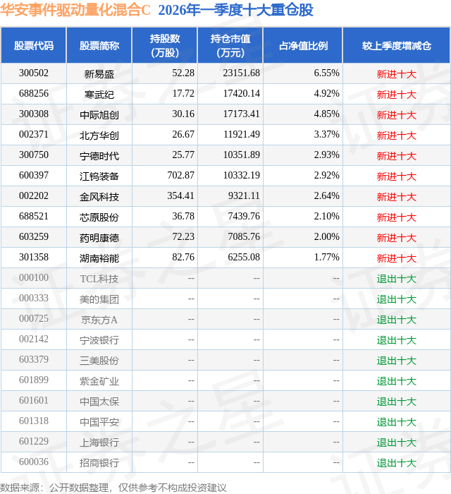 证券之星消息,日前华安事件驱动量化混合C基金公布一季报,2026年一季度最新规模18.04亿元,季度净值涨幅为-4.89%。