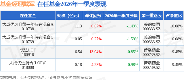 证券之星消息,日前大成优选混合(LOF)C基金公布一季报,2026年一季度最新规模0.18亿元,季度净值涨幅为-0.98%。