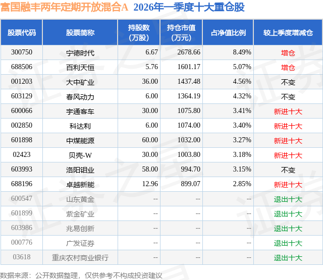 从基金规模来看,富国融丰两年定期开放混合A基金2026年一季度公布的基金规模为2.03亿元,较上一期规模2.99亿元变化了-9600.43万元,环比变化了-32.11%。该基金最新一期资产配置为:股票占净值比93.38%,债券占净值比0.64%,现金占净值比6.19%。从基金持仓来看,该基金当季前十大股票仓位达41.7%,第一大重仓股为宁德时代(300750),持仓占比为8.49%。