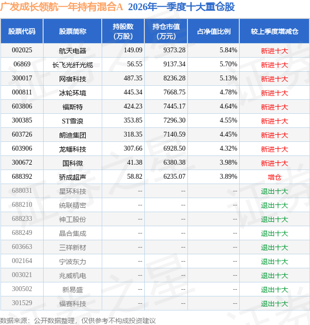 从基金规模来看,广发成长领航一年持有混合A基金2026年一季度公布的基金规模为11.16亿元,较上一期规模1.77亿元变化了9.4亿元,环比变化了532.08%。该基金最新一期资产配置为:股票占净值比93.39%,债券占净值比1.41%,现金占净值比10.42%。从基金持仓来看,该基金当季前十大股票仓位达47.28%,第一大重仓股为航天电器(002025),持仓占比为5.84%。