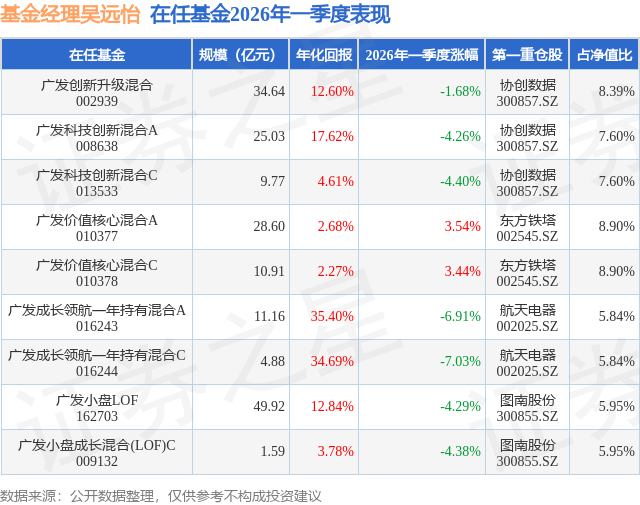 证券之星消息,日前广发成长领航一年持有混合A基金公布一季报,2026年一季度最新规模11.16亿元,季度净值涨幅为-6.91%。
