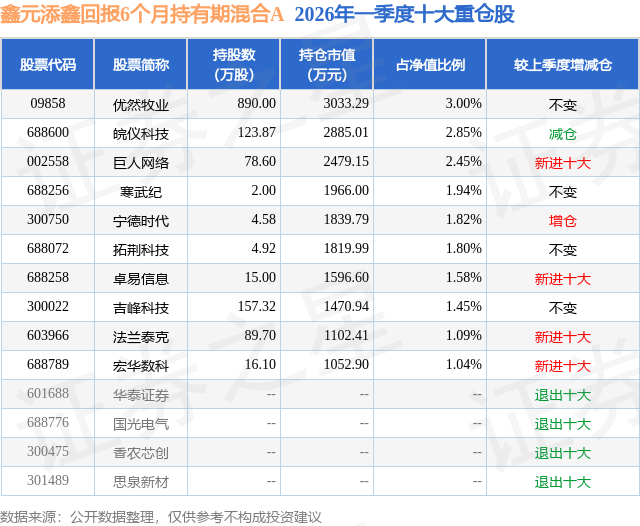 从基金规模来看,鑫元添鑫回报6个月持有期混合A基金2026年一季度公布的基金规模为9.53亿元,较上一期规模1.62亿元变化了7.91亿元,环比变化了488.93%。该基金最新一期资产配置为:股票占净值比26.4%,债券占净值比82.84%,现金占净值比1.25%。从基金持仓来看,该基金当季前十大股票仓位达19.02%,第一大重仓股为优然牧业(09858),持仓占比为3.0%。
