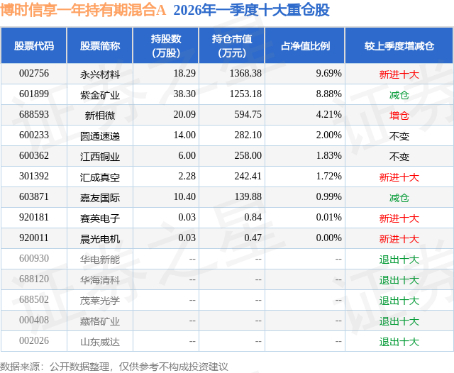 从基金规模来看,博时信享一年持有期混合A基金2026年一季度公布的基金规模为0.77亿元,较上一期规模2.16亿元变化了-1.39亿元,环比变化了-64.26%。该基金最新一期资产配置为:股票占净值比29.32%,债券占净值比34.86%,现金占净值比11.9%。从基金持仓来看,该基金当季前十大股票仓位达29.33%,第一大重仓股为永兴材料(002756),持仓占比为9.69%。