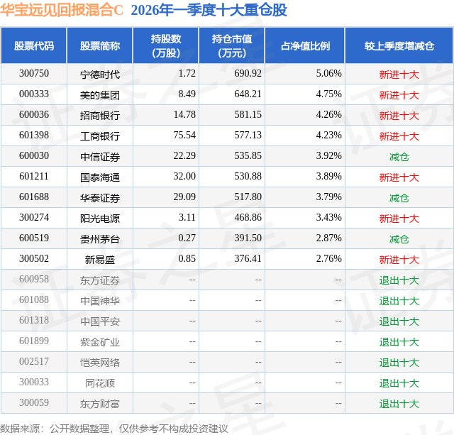 从基金规模来看,华宝远见回报混合C基金2026年一季度公布的基金规模为0.16亿元,较上一期规模7595.78万元变化了-5961.39万元,环比变化了-78.48%。该基金最新一期资产配置为:股票占净值比74.79%,无债券类资产,现金占净值比25.65%。从基金持仓来看,该基金当季前十大股票仓位达38.96%,第一大重仓股为宁德时代(300750),持仓占比为5.06%。