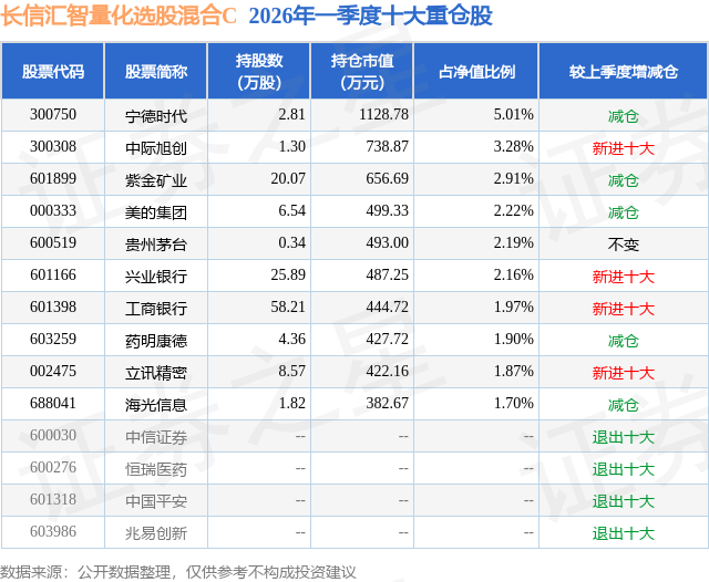 证券之星消息,日前长信汇智量化选股混合C基金公布一季报,2026年一季度最新规模0.37亿元,季度净值涨幅为-1.02%。