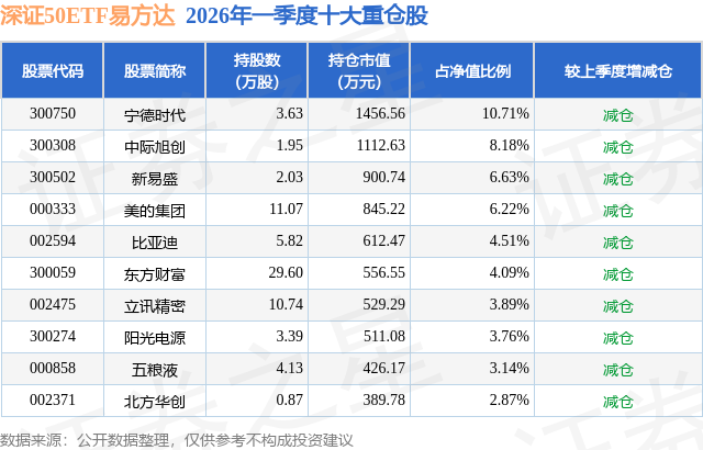 从基金规模来看,深证50ETF易方达基金2026年一季度公布的基金规模为1.36亿元,较上一期规模1.71亿元变化了-3462.75万元,环比变化了-20.3%。该基金最新一期资产配置为:股票占净值比99.34%,无债券类资产,现金占净值比0.83%。从基金持仓来看,该基金当季前十大股票仓位达54.0%,第一大重仓股为宁德时代(300750),持仓占比为10.71%。