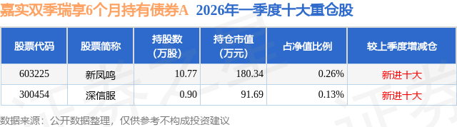 从基金规模来看,嘉实双季瑞享6个月持有债券A基金2026年一季度公布的基金规模为6.45亿元,较上一期规模36.59亿元变化了-30.14亿元,环比变化了-82.37%。该基金最新一期资产配置为:股票占净值比0.4%,债券占净值比130.11%,现金占净值比2.58%。从基金持仓来看,该基金当季前十大股票仓位达0.39%,第一大重仓股为新凤鸣(603225),持仓占比为0.26%。