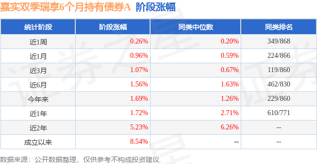 从业绩表现来看,嘉实双季瑞享6个月持有债券A基金过去一年净值涨幅为1.72%,在同类基金中排名610/771,同类基金过去一年净值涨幅中位数为2.71%。而基金过去一年的最大回撤为-1.23%,成立以来的最大回撤为-1.48%。